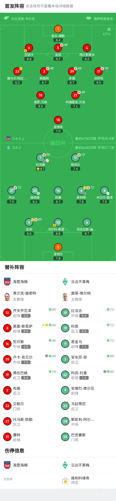 在技术统计上,云达不莱梅凭借出色的传球和射门表现占据了明显的优势。球队的控球率和射正率都较高,体现了他们在比赛中对于节奏和机会的把握能力。而海登海姆在防守端也略显疲态,面对对手的进攻往往显得力不从心,导致了比分的被动局面。