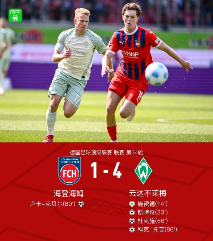 云达不莱梅队的杜克施在第66分钟再次有出色表现,得益于米切尔-魏泽的助攻,他成功将比分改写为3-0,为球队奠定了胜局基础。尽管海登海姆在第80分钟由卢卡-克贝尔在莱奥-斯恩萨的助攻下追回一球,但这并未改变比赛的走势。最终,云达不莱梅的科克-托普在第86分钟打入另一球,为球队锁定了4-1的胜局。